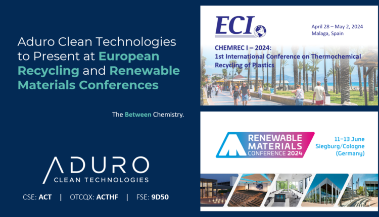 Aduro Clean Technologies Inc. (“Aduro” or the “Company”) (CSE: ACT) (OTCQX: ACTHF) (FSE: 9D50), a Canadian technology company using the power of chemistry to transform lower value feedstocks, like waste plastics, heavy bitumen, and renewable oils, into resources for the 21st century, is pleased to announce its participation at two industry conferences focused on the advancement of advanced chemical recycling and renewable materials.