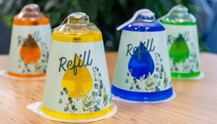 The aluminium cartridge is a recyclable refill solution.